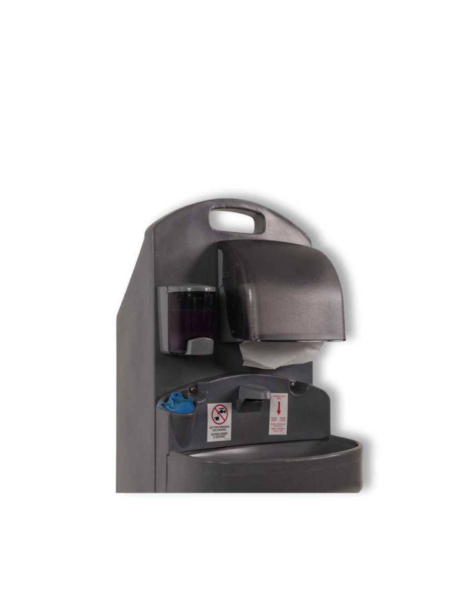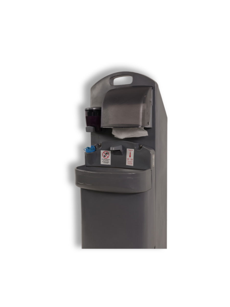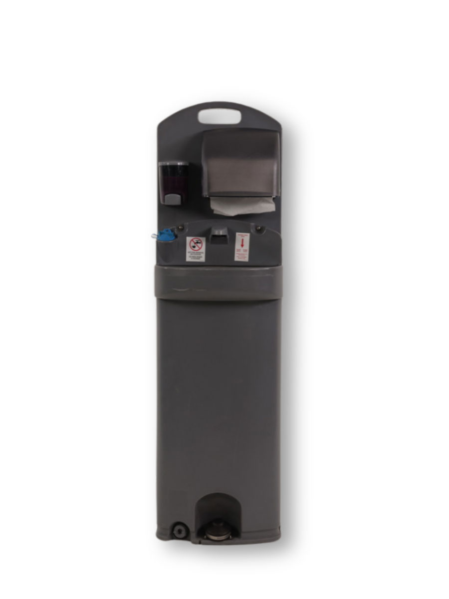 - HandStand: This “sink on wheels” is ideal for pairing with portable restrooms. The HandStand is an excellent all-purpose handwashing sink unit for all occasions. The system includes a convenient hands-free foot pump operation, a sizeable washbasin, and soap and paper towels.