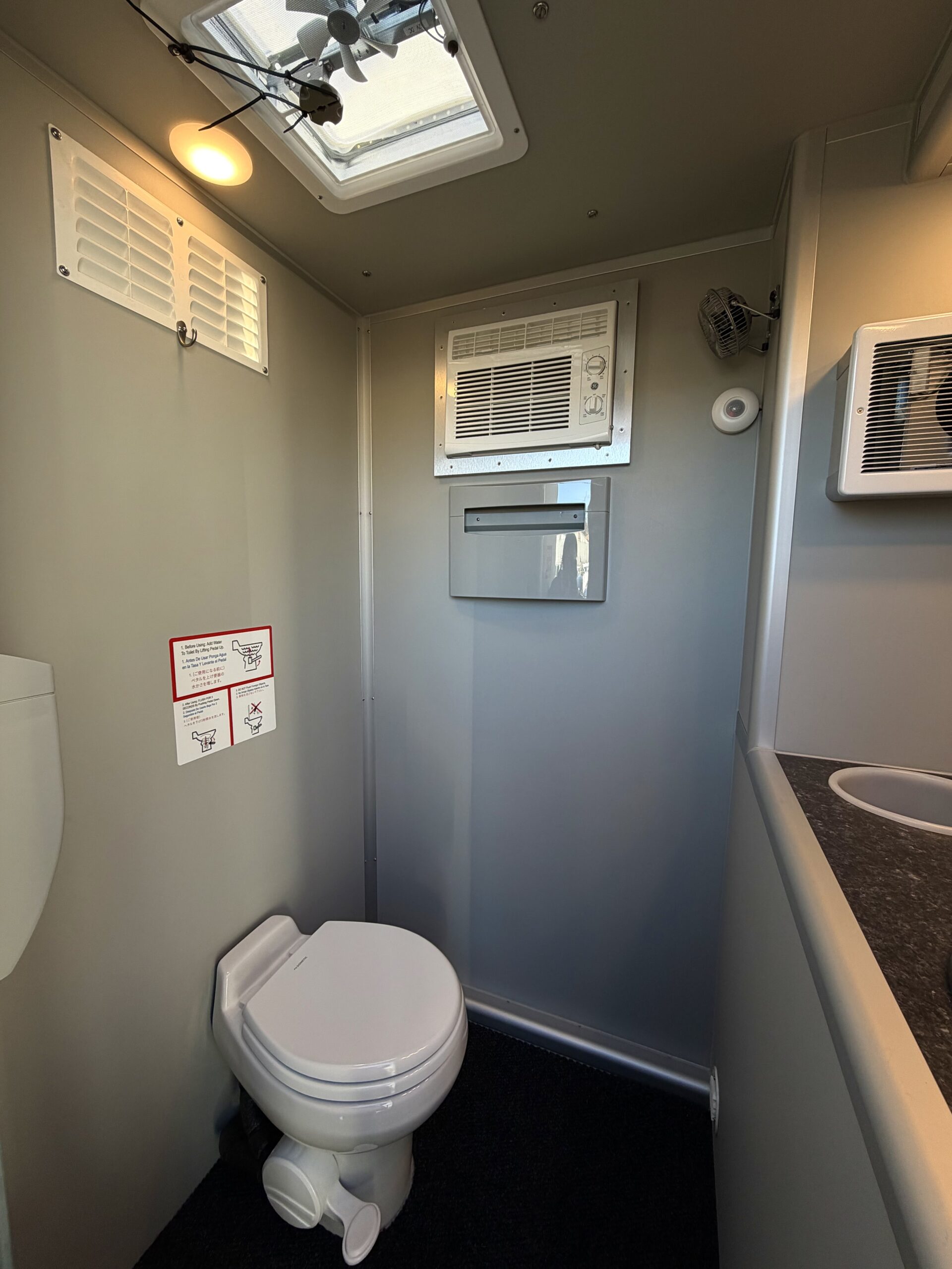 - Premium Comfort - Features include weatherproof carpeting, a powered roof vent for continuous air circulation, a flushable toilet with a Teflon seal, and clear LED interior/exterior "In-Use" lights.