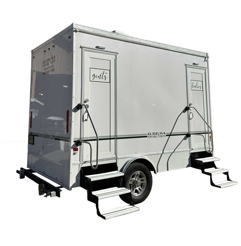 Our 2-station restroom trailer rentals are thoughtfully designed to stand out in appearance and functionality. With a focus on convenience and user satisfaction, our bathroom trailer rentals are built to deliver the perfect balance of luxury and practicality. Here are the key features that make them an exceptional choice: